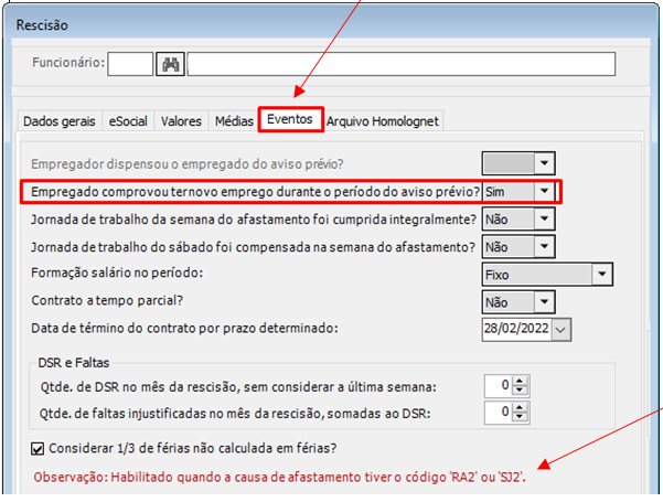 Ao marcar o campo em destaque na tela do Cálculo de Rescisão, o campo de comprovação de novo emprego na aba Eventos mudará de Sim para Não.