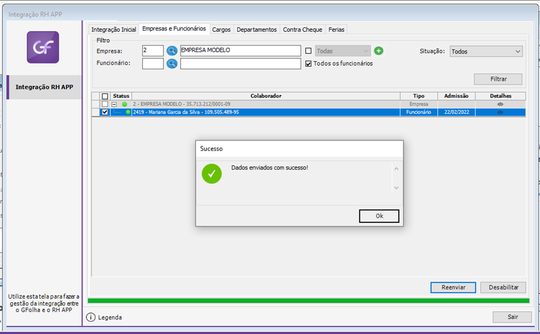 Caso o usuário posteriormente deseje enviar essa alteração basta ir a tela de integração GFolha x RHAPP, selecionar o funcionário e selecionar a opção reenviar.