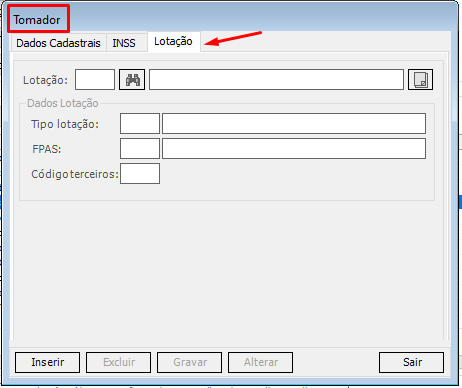 Após o cadastro do tipo de lotação, selecione a lotação pertinente ao Tomador através do menu Cadastro > Localização > Tomador > aba Lotação.