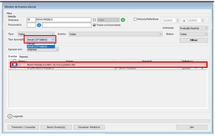No campo Período apuração foi incluído a opção ‘Anual (13º salário)’,ao selecionar essa opção e clicar no botão executar o evento S-1299 referente ao 13º salário será gerado em nosso Monitor Eventos. O mesmo processo deverá ser realizado para geração do evento S-1298 (Reabertura).