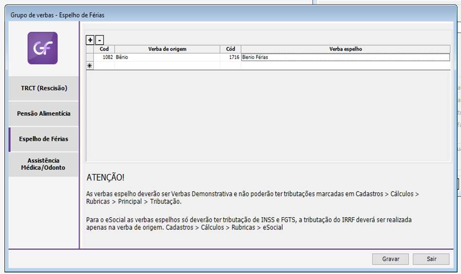 Criamos ainda um novo Grupo de Verbas para a configuração do espelhamento das verbas de Férias.