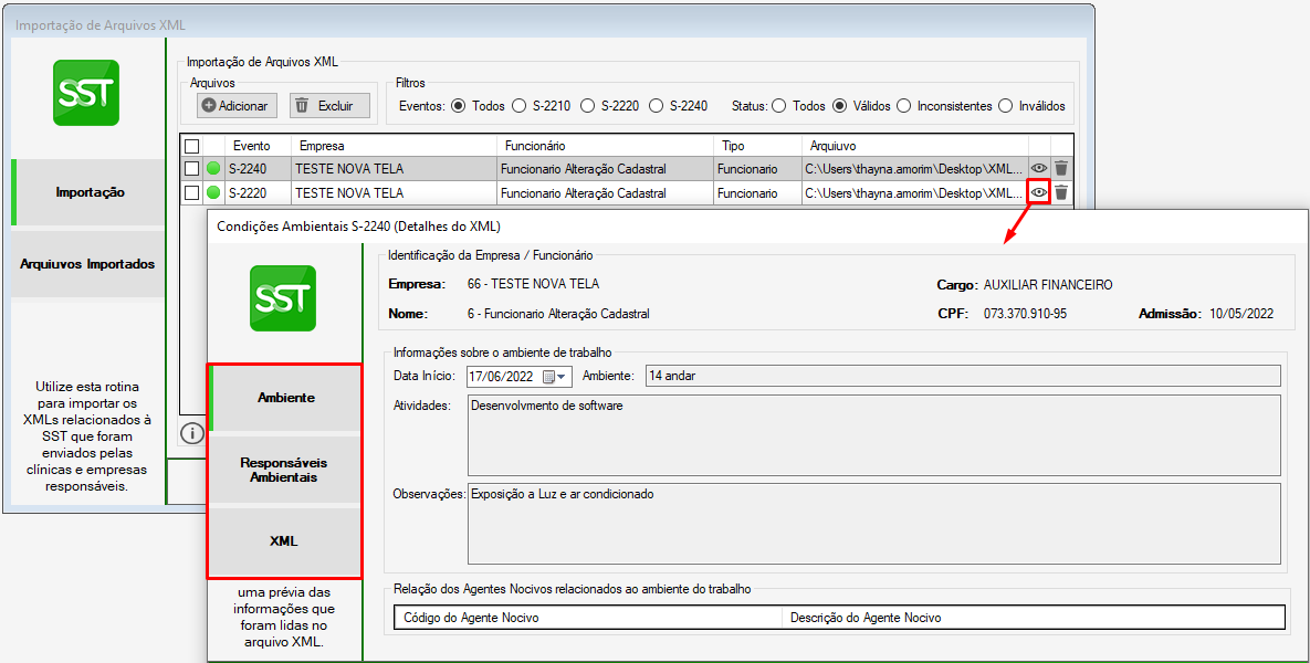 Ao importar cada evento, eles poderão ser identificados em cada uma das rotinas no GSST, pois são identificados através do desenho do XML no topo da tela do cadastro do evento, diferenciando dessa forma os eventos que foram importados dos que foram cadastrados no sistema.