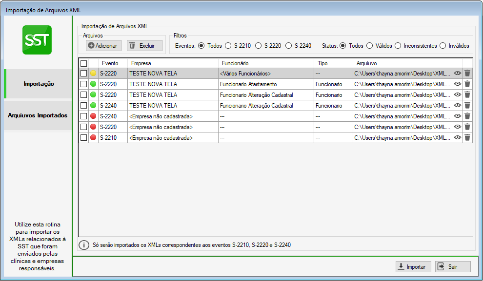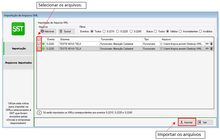 Após a análise dos arquivos importados, descartados os arquivos com erros e corrigido os eventos com inconsistência é hora de efetivar a importação do XML no GSST.
