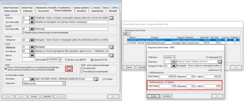 IMPORTANTE: para funcionários com múltiplos vínculos, no cadastro – aba Rotinas Trabalhistas, foi incluído o quadro de informações referentes ao INSS Recolhido 13º salário.