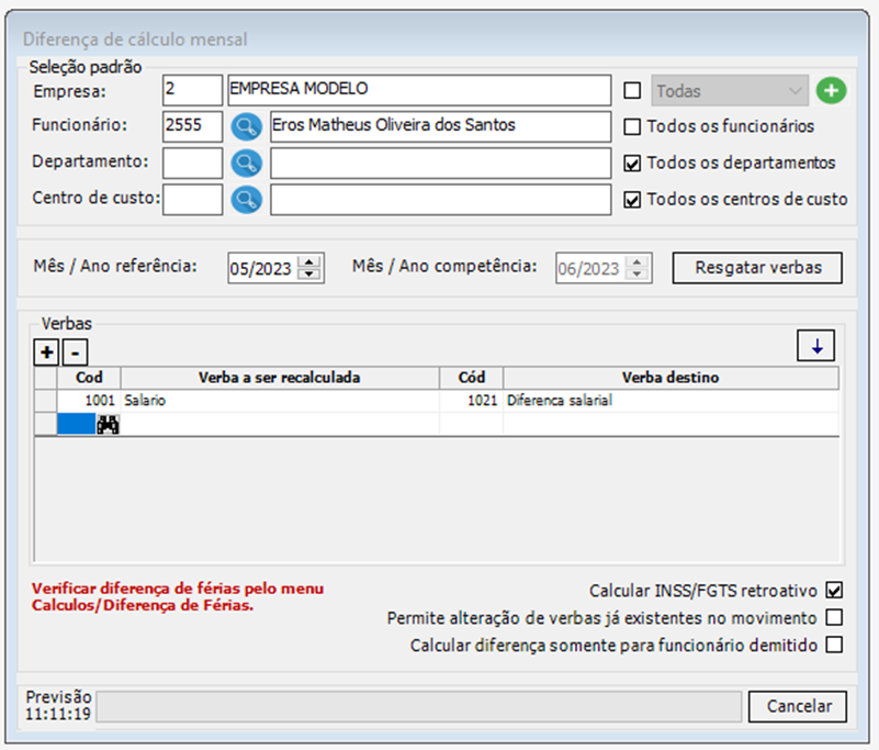 Sabemos que nossos usuários estão acostumados a calcular as diferenças salarias utilizando a verba ‘1021 – Diferença Salarial’, porém para esse processo de cálculo de diferenças de reajuste salarial devido a Convenção Coletiva e Acordo coletivo deverão ser calculadas utilizando a verba “1121 – Diferenças salarial períodos anteriores”, pois apenas essa verba tem a configuração devida para apuração de INSS e FGTS retroativo referente a esses valores nos respectivos períodos. Se utilizarmos a verba ‘1021 – Diferença Salarial’ os valores de INSS e FGTS serão calculados juntamente do mensal do período atual, gerando conflito nas entregas para o eSocial.