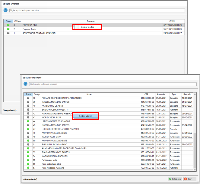 Copiar Dados na Tela de Seleção de Empresa ou Funcionários.